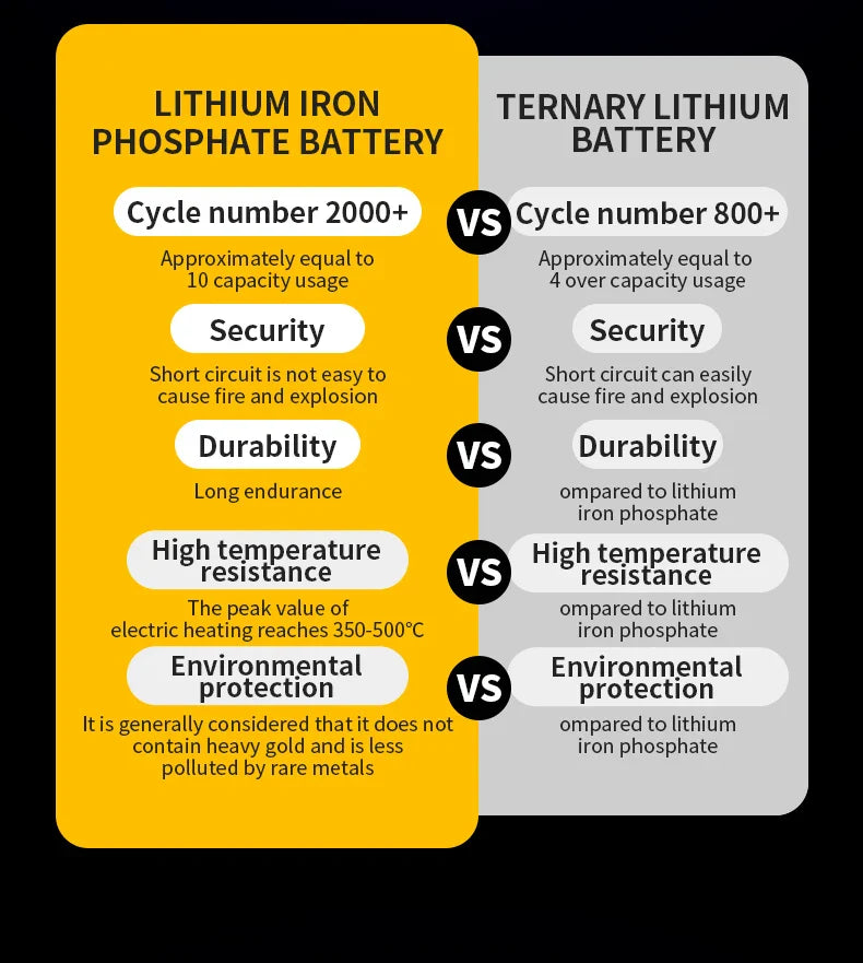 Battery Technology: • LiFePO4 (Lithium Iron Phosphate) • 2000+ Charge Cycles • 10-Year Capacity Life • High-Temperature Resistant (350-500°C) • Environmentally Friendly • Enhanced Safety Features