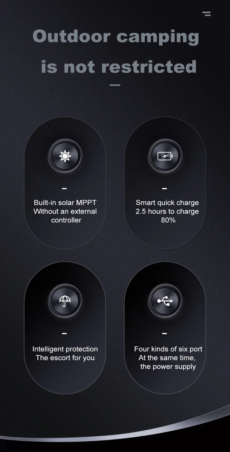Charging Options: • Solar Panel Input • AC Adapter • Car Charging Port • MPPT Controller