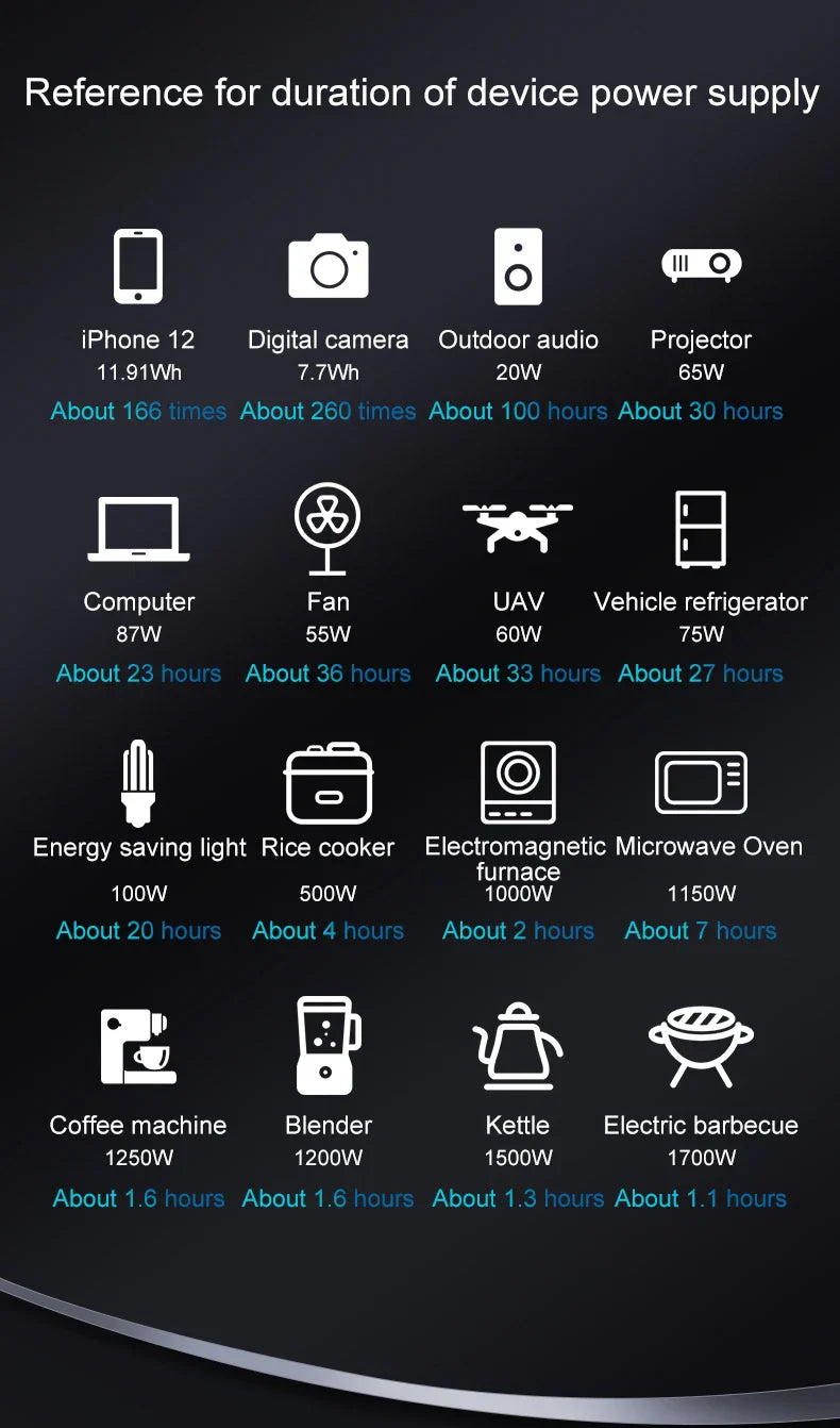 Technical Specifications: • Power Options: 500W/1000W/2000W • Battery Capacity: 150000mAh • Battery Type: Ternary Lithium-Ion • Battery Voltage: 12.6V • AC Peak Power: 500W • LED Light: 10W • Model: ZXOPS