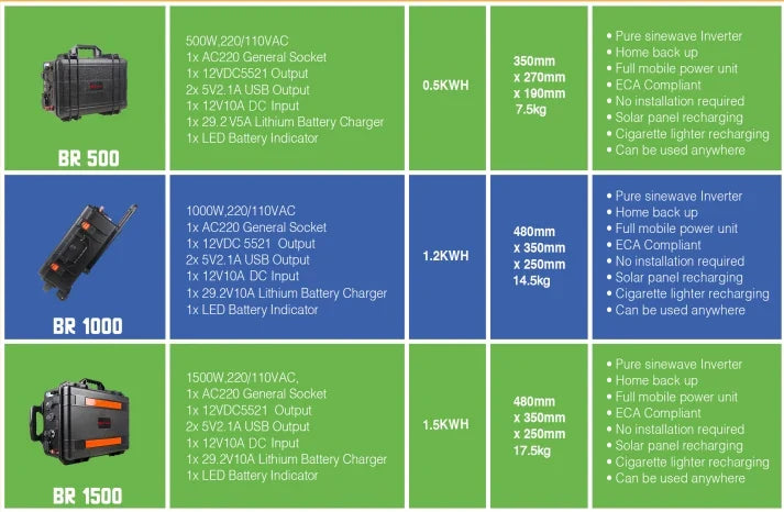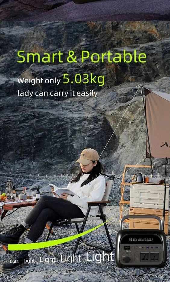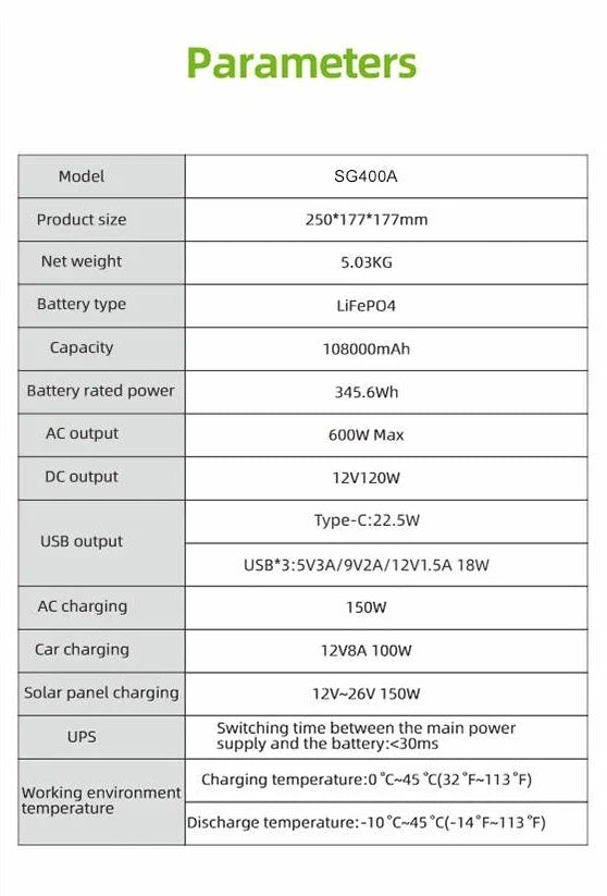 Technical Specifications: • Power Options: 300W/500W/1000W/2000W • Battery Type: LiFePO4 • Capacity: 108000mAh/345.6Wh • Max AC Output: 600W • Dimensions: 250 x 177 x 177mm • Weight: 5.03kg • Lifecycle: 6000+ Cycles