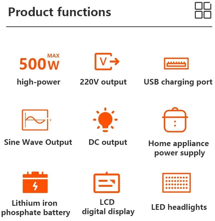Technical Specifications: • Power Options: 200W/500W/1000W • Rated Power: 300W • Peak Power: 600W • Battery Capacity: 75000mAh • Battery Voltage: 11.1V~12.8V • Dimensions: 252 x 162 x 180mm • Weight: 6kg