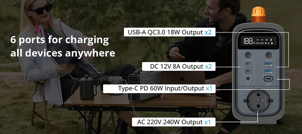 With 1 x AC port, 2 x DC ports, 2 x QC3.0 USB ports, and 1 x 60W PD charging port, this power station can charge up to 6 devices simultaneously while it gets charged (Supports Pass Through Charging), enough to power most of your electric devices and effectively save your space on wall! Suitable for outdoor activities such as camping, RV, outdoor party, fishing,