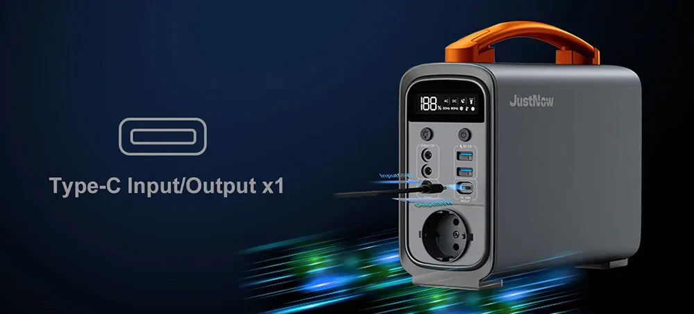 JustNow 240 W power station supports five charging methods: 60W DC adapter, solar panel, 12V car charging, or PD 60W fast charging. In the meantime, it supports 60W DC adapter + PD 60W fast charging, the charging power reaches 120W, and it only takes 2.5 hours to be fully charged under fast charging.