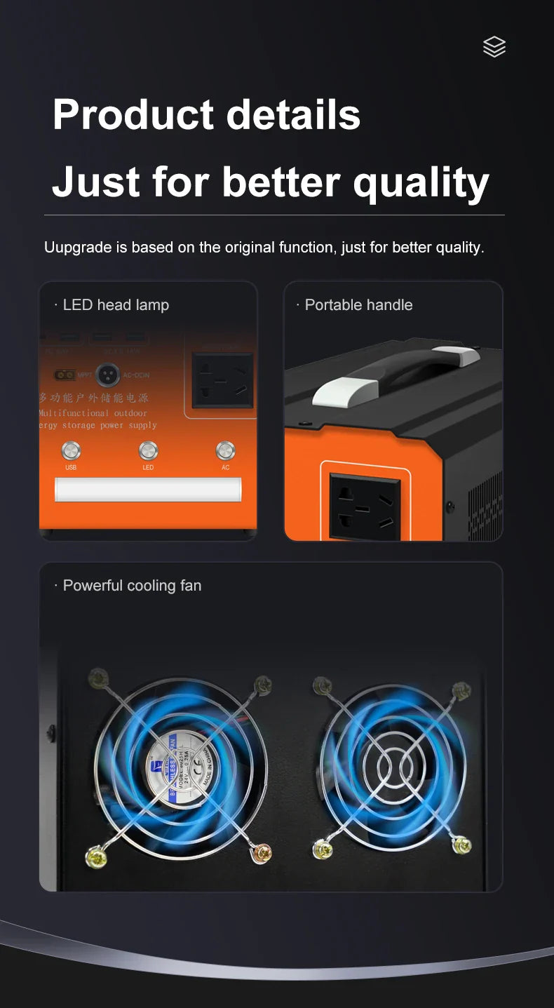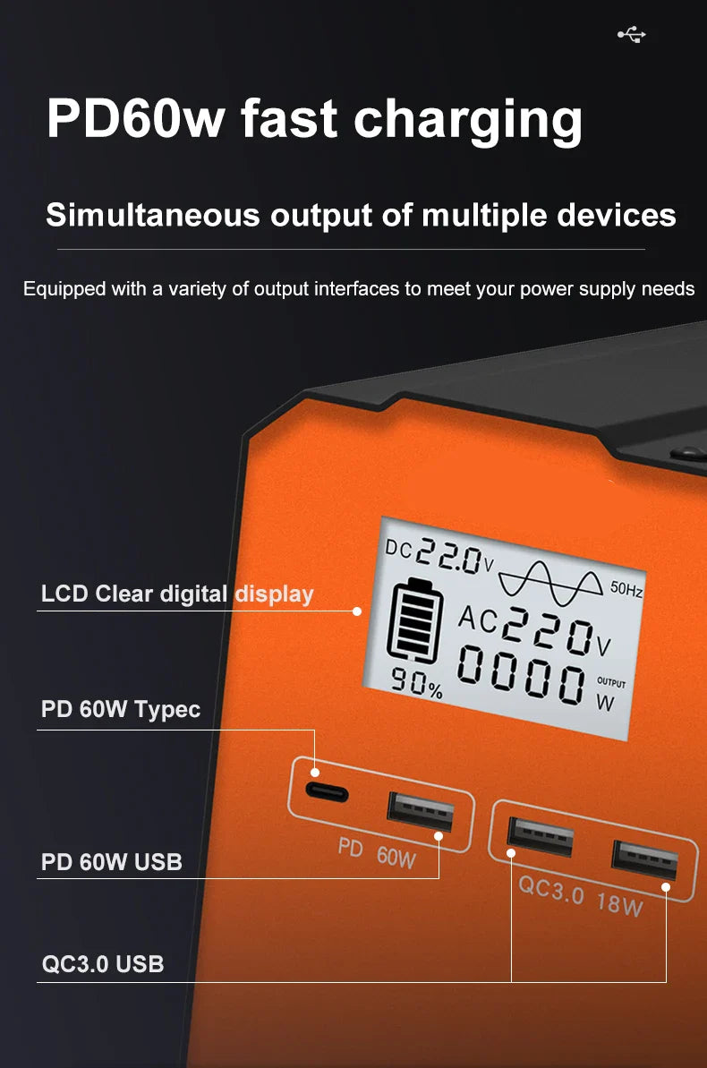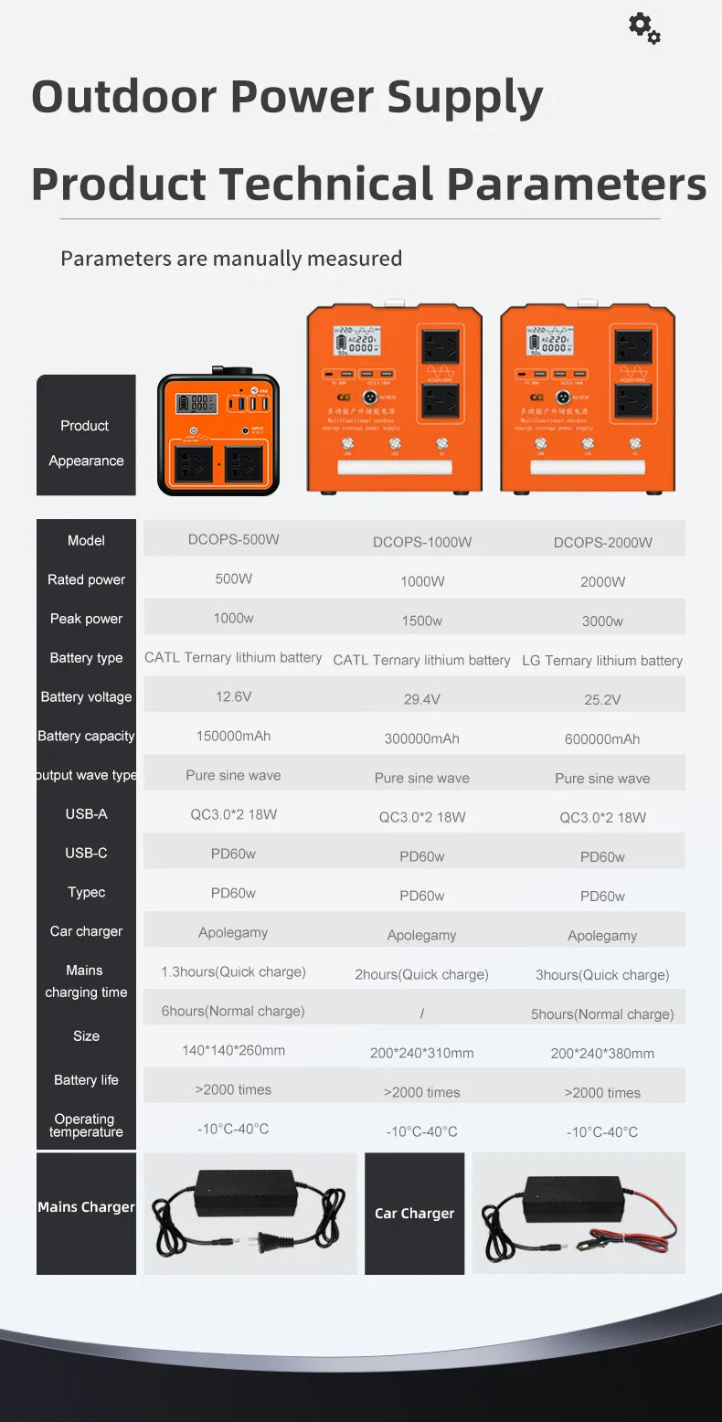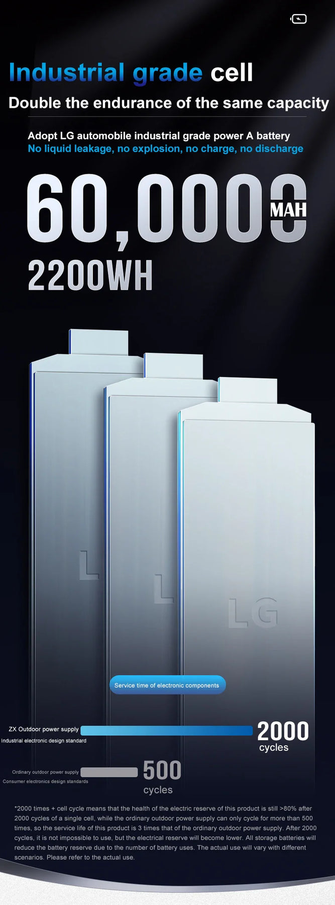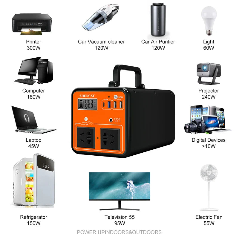 Technical Specifications: • Power Options: 500W/1000W/2000W • Battery Capacity: 150000mAh • Battery Type: Ternary Lithium-Ion • Battery Voltage: 12.6V • AC Peak Power: 500W • LED Light: 10W • Model: ZXOPS