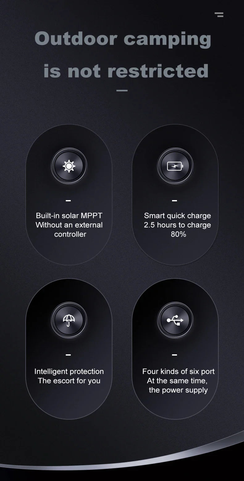 Charging Options: • Solar Panel Input • AC Adapter • Car Charging Port • MPPT Controller Technology